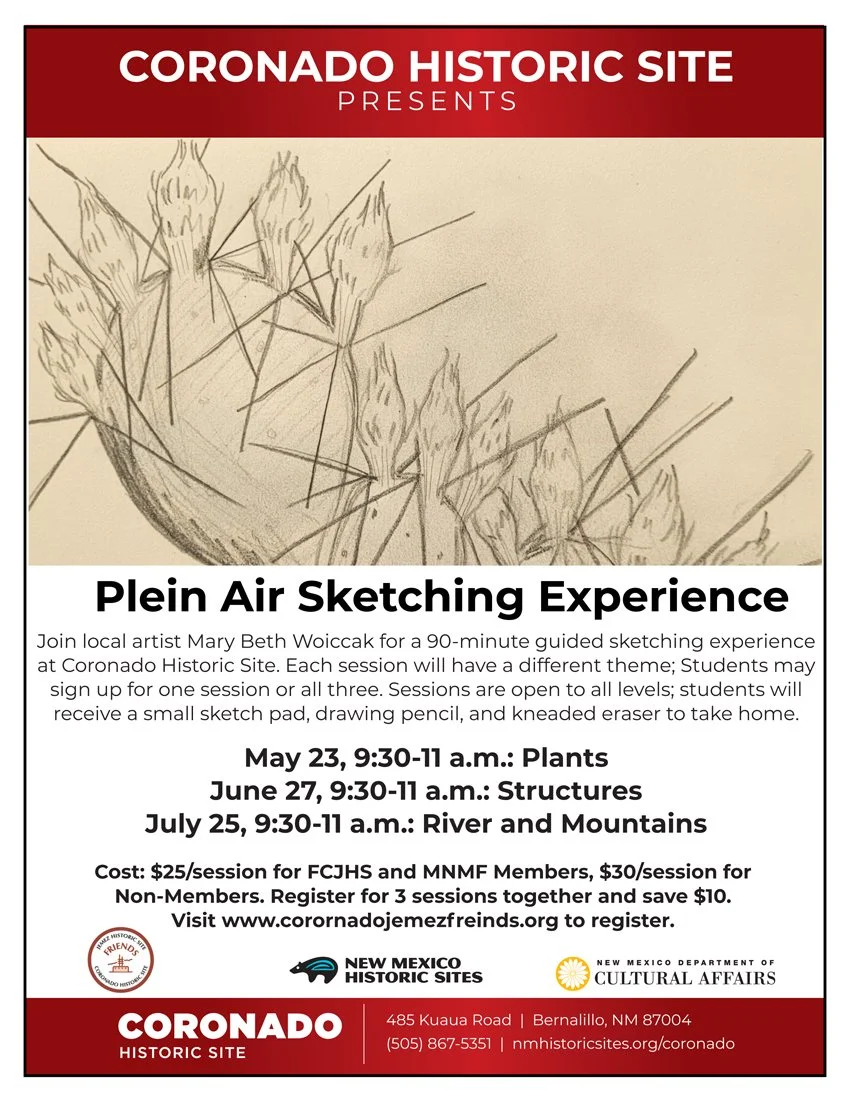 I am excited to guide these sketching sessions! Let’s walk along the paths of the Coronado Historic Site and the ancient Kuaua Pueblo. We’ll slow down to take a closer look at the plants, structures, and views of the Rio Grande River and Sandia Mountains. Sign up for 1 or all 3 sessions! Cost includes art supplies for you to use and take home. Check out the flyer below for more details.
