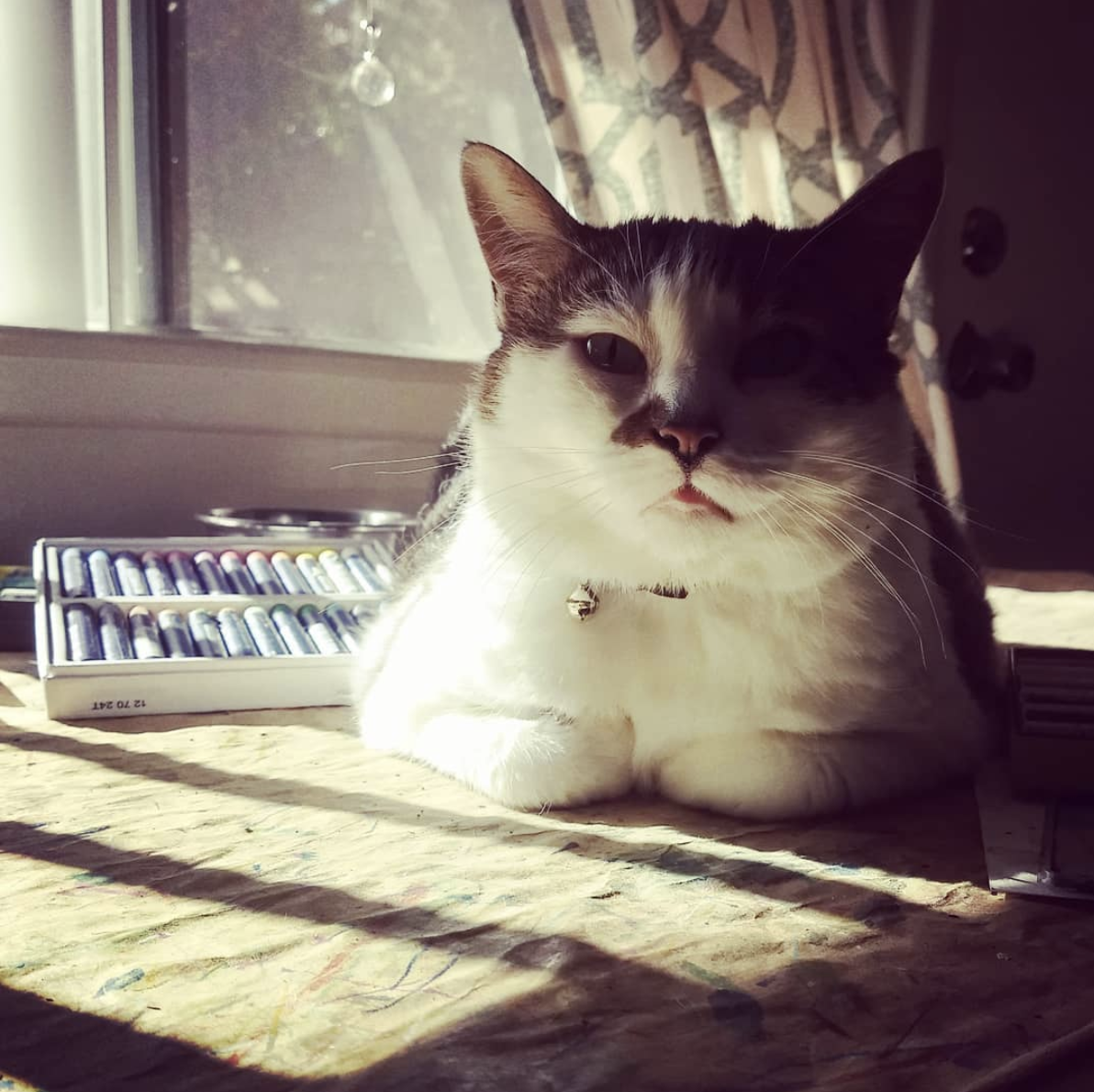 My cat and I share the studio. We both use the art table because it has the best light in the house. I can’t come between my cat and the warm glorious sun rays through a window. She is also a watch cat: the art table is the best perch to watch the outside world.